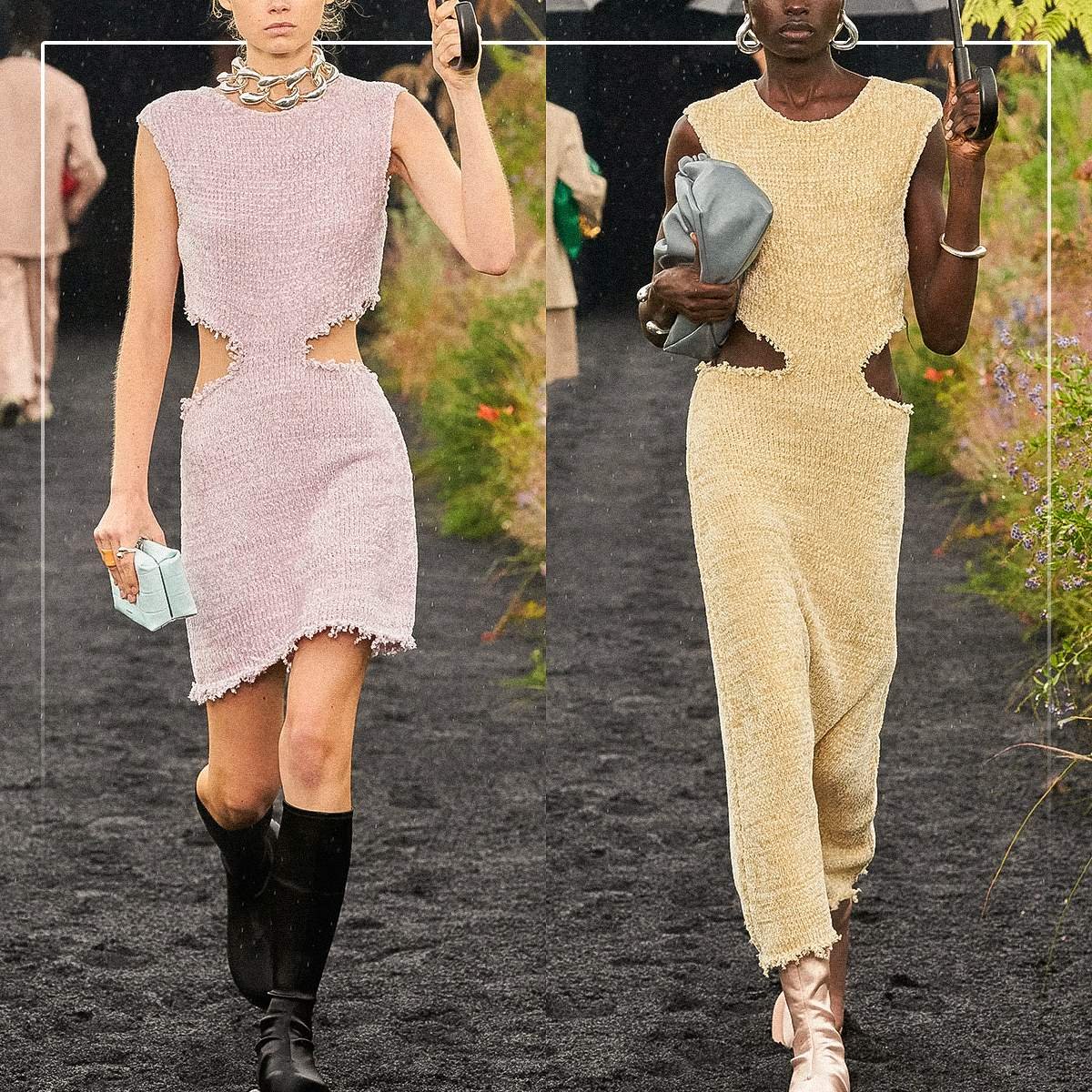 Еще одна интересная тенденция — крупные отверстия в вязаном полотне или выкройки специфической формы. Преимущественно «вырезы» встречаются в районе талии.