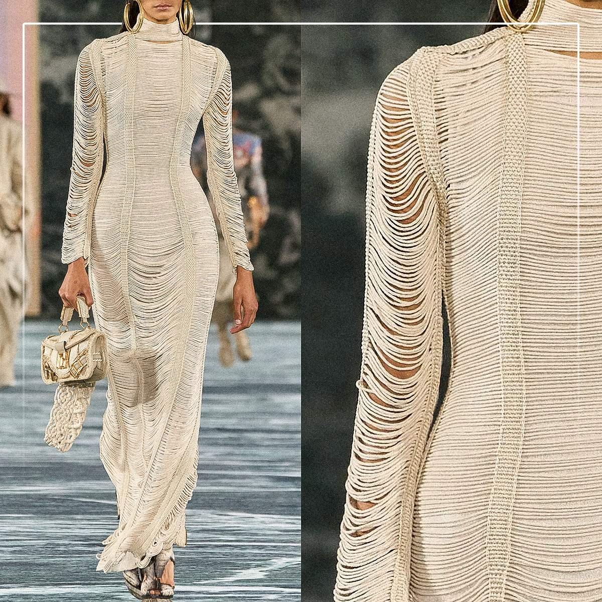Одна из самых популярных техник плетения, набирающая обороты — макрамэ. Ремешки для сумочек, сумки, платья, костюмы — на подиумах можно встретить все.