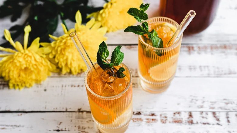 5. Разлить холодный чай по стаканам и по желанию уложить в каждый листики мяты.